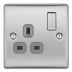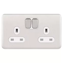 British General Evolve 13A 1-Gang SP Switched Socket + 2.1A 2-Outlet Type A USB Charger Brushed Steel with White Inserts