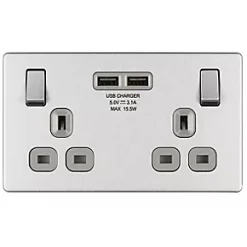Single power socket with 2 USB charging ports. Offers ability to charge mobile devices without sacrificing power socket. Auto-detects USB device and adjusts charging pattern to suit, switching to standby mode when fully charged to prevent overload. Features low profile, screwless flat plate that clips on and off, making it ideal for modern interiors.