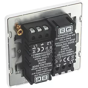 Evolve, trailing edge, double dimmer switch that controls light levels and sets mood. Intelligent electronic circuit monitors connected load and provides a soft-start with protection against thermal, current and voltage overload. Suitable for dimming LED, dimmable CFLs and traditional lighting. Soft-start brings the lights to a set level in around 1 second and extends lamp life. Silent operation means no noise when dimming, while support for low wattage lamps eliminates flicker. Low profile screwless flat plate that clips on and off. Ideal for modern interiors.