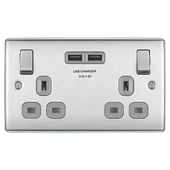 Decorative metal socket with USB charging, 2 x USB ports, 4.2A total. Ideal for charging iPads, iPhones, tablets, mobiles, cameras, MP3s and more. Features angled, in-line terminals and includes backed out captive screws for easy installation. Quick and easy to install. Fits in a 25mm wall box. Supplied with a 10mm spacer.