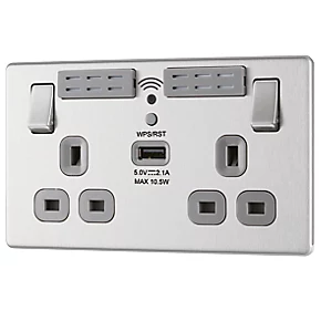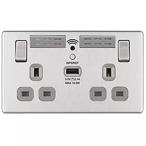 LAP 13A 2-Gang SP Switched Wi-Fi Extender Socket + 2.1A 1-Outlet Type A USB Charger Brushed Stainless Steel with Graphite Inserts