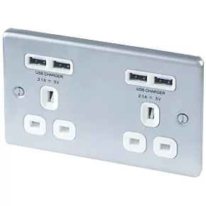 Decorative socket with 4 x USB charging ports. Ideal for charging iPads, iPhones, tablets, mobile phones, cameras and MP3s. Features angled, in-line terminals and backed-out captive screws for easy installation.