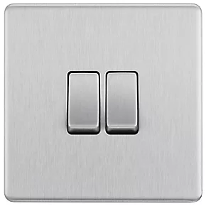 Brushed stainless steel switch with decorative, screwless flat-plate. Slim, clip-on profile to complement any interior decor. Easy to install, ideal for redecoration projects.