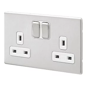 MK Aspect 13A 2-Gang DP Switched Plug Socket Brushed Stainless Steel with White Inserts