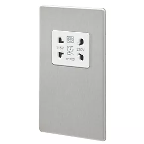 MK Aspect 2-Gang Dual Voltage Shaver Socket 115 / 230V Brushed Stainless Steel with White Inserts