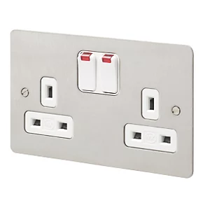 MK Edge 13A 2-Gang DP Switched Plug Socket Brushed Stainless Steel with Neon with White Inserts